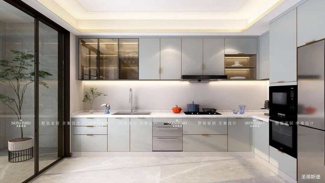 厨房现代智能的设计对精致生活进行了全新的诠释,同时也呈现了居者追求精简生活的内涵。智能的厨房电器嵌入同色系的柜体中,时尚科技感十足。